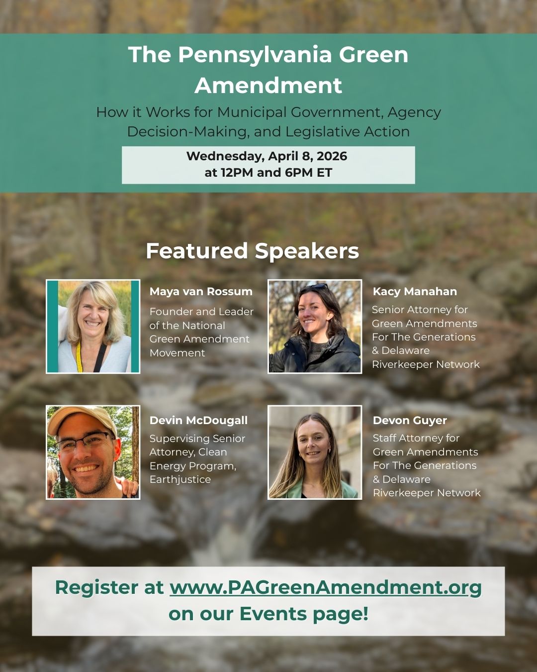 Join Green Amendments For The Generations for an in-depth webinar all about the Pennsylvania Green Amendment, including its history, language, and applications at the state and local government levels. Experts will speak specifically to Green Amendment obligations and opportunities for municipal government officials, state regulatory agencies, and state legislators, followed by a Question and Answer session. Resources will be made available during and after the webinar.